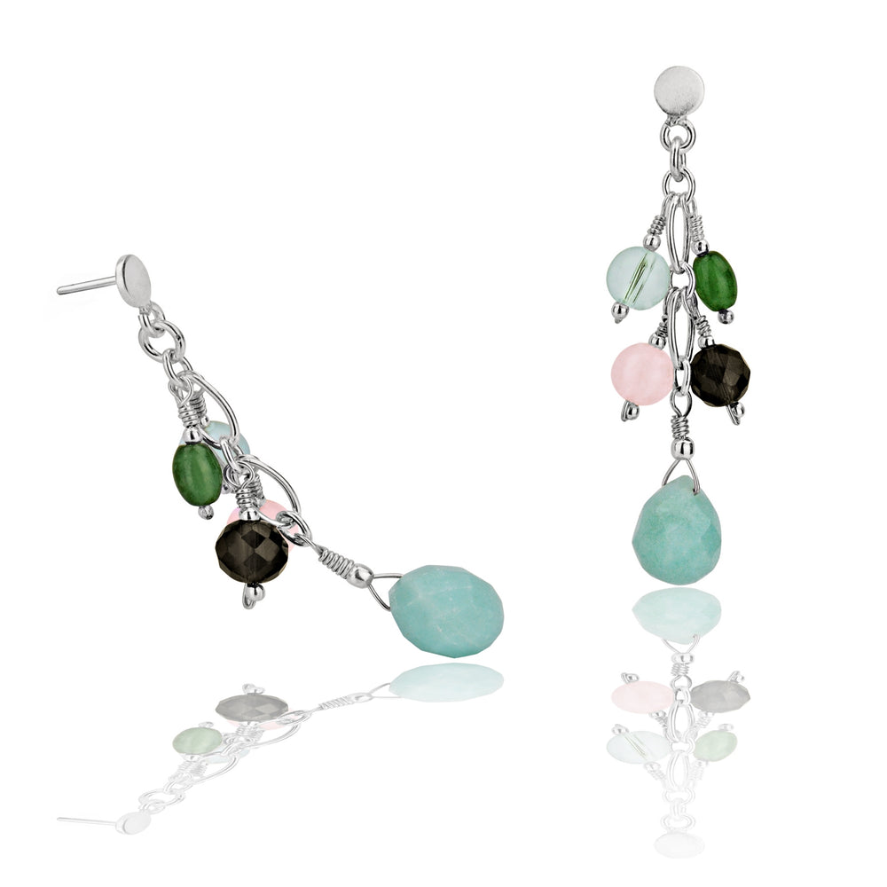 Silver, Chinese Amazonite, Smoky Topaz, Pink and Green Jade Cluster Drop Earrings